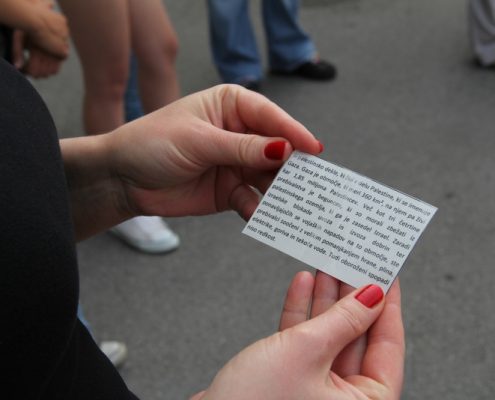 Drugi del delavnice pa je postavil nas v kožo begunca. Bili smo časovno omejeni pri izboru, kaj in koga bomo vzeli s seboj. Bili smo brez denarja in zagotovljene varnosti, v ciljni državi nismo bili sprejeti, kar nas je obdalo z občutkom groze. Ko smo primerjali svoje odgovore, smo se spustili v globoko razpravo o tem, kako beguncu zares pomagati.
