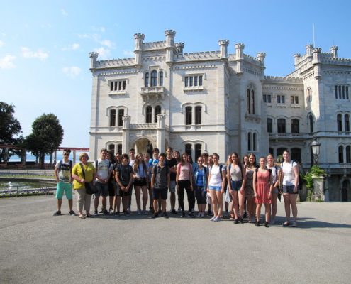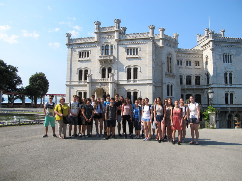 Najprej smo se ustavili v Repentabru, kjer smo si ogledali utrdbo, zgrajeno za obrambo pred Turki, ter cerkev, posvečeno Devici Mariji. Nato smo se odpravili do gradu Miramar, kjer smo spoznali nekaj zgodb o življenju Maksimiljana in Habsburžanov ter se sprehodili po parku. Naslednji postanek smo si privoščili v Štivanu. Tam smo si ogledali cerkev, posvečeno sv. Janezu Krstniku, v času Rimljanov pa je tam stal tempelj. Ogledali smo si tudi izvire reke Timav. To je reka, ki v Škocjanskih jamah ponikne pod imenom reka Reka ter v Štivanu zopet priteče na površje, in sicer kot Timava.