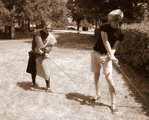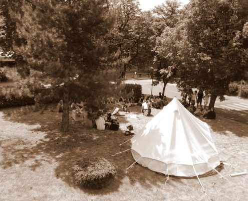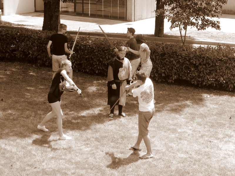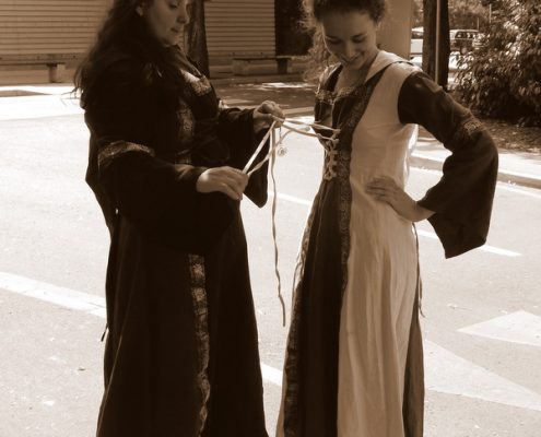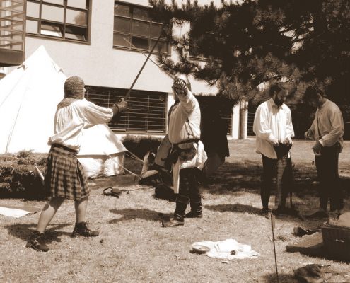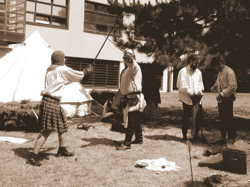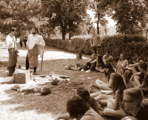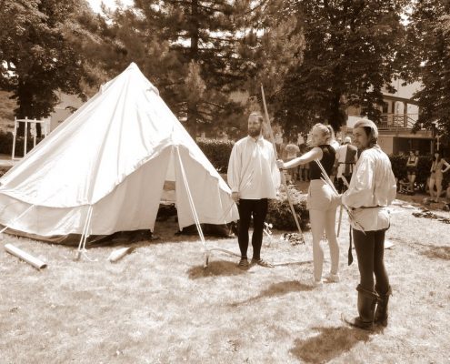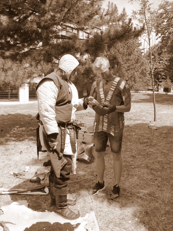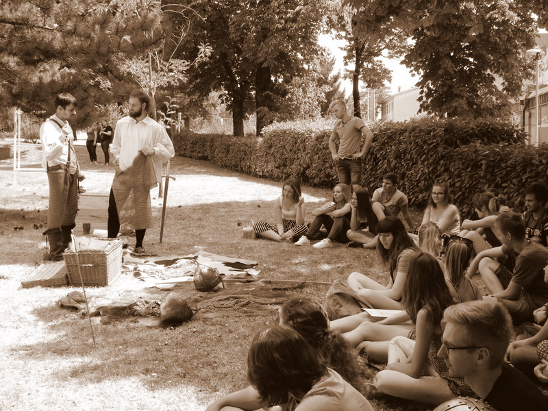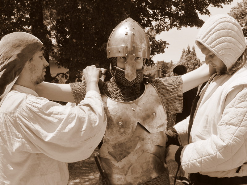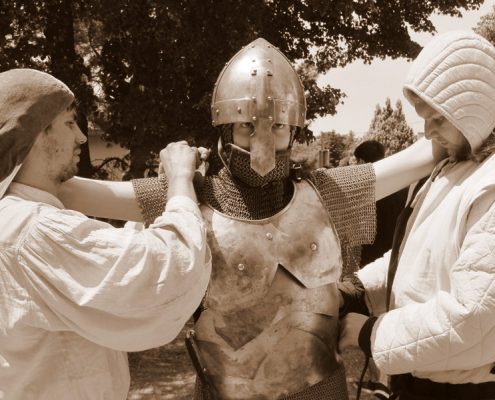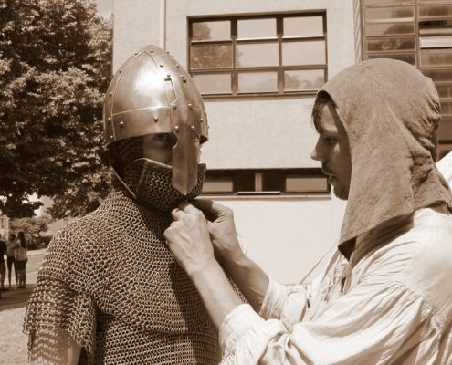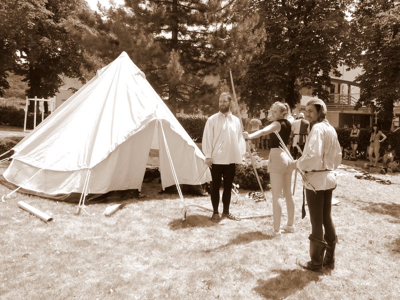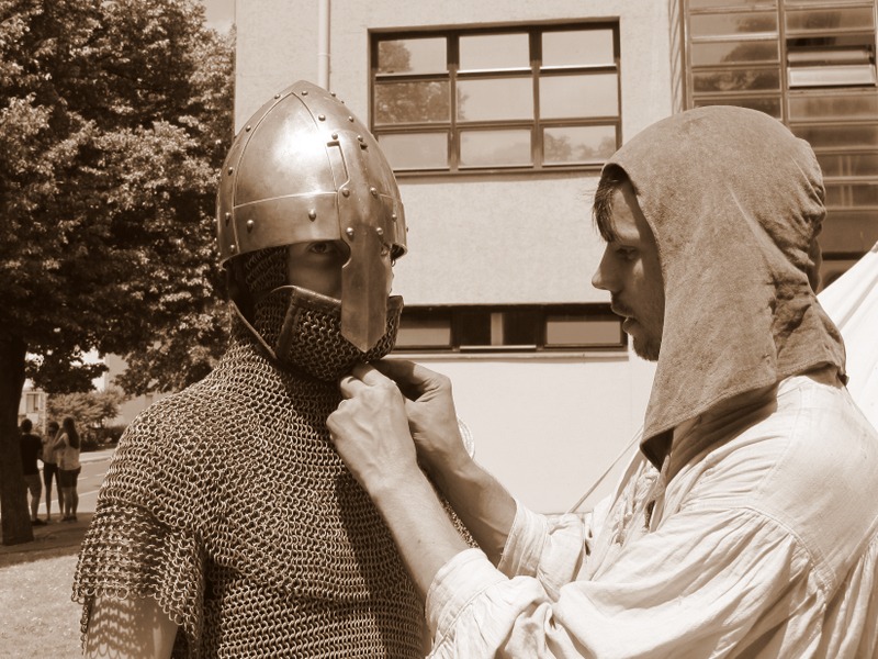 Temu ustrezna je tudi njihova oprema. Postavili so šotor, pokazali posodo, obleko, obutev in orožje. Dijake so najbolj pritegnile verižne srajce, oklepi in meči, tako da so se nekateri kar preoblekli v viteze. Najbolj pogumni pa so se preizkusili tudi v mečevanju in streljanju z lokom.