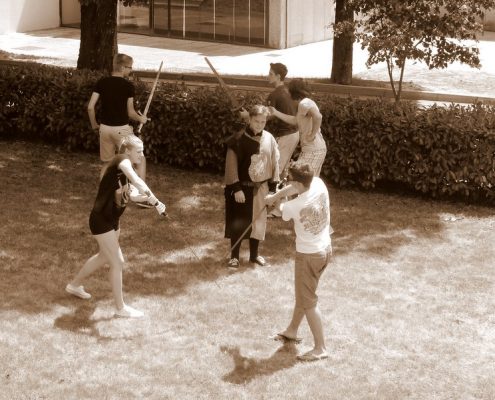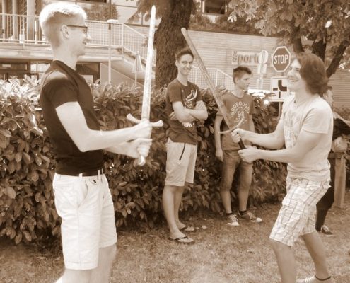 V sredo, 21. junija 2017, so travnik pred našo šolo zasedli srednjeveški vitezi iz Društva varuhov kladiva iz Pivke. Dijakom prvega letnika ekonomskega in aranžerskega programa in drugega letnika gimnazije, so predstavili svoj način življenja in bojevanja. Sodijo v čas med 13. in 15. stoletjem.