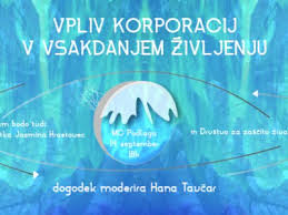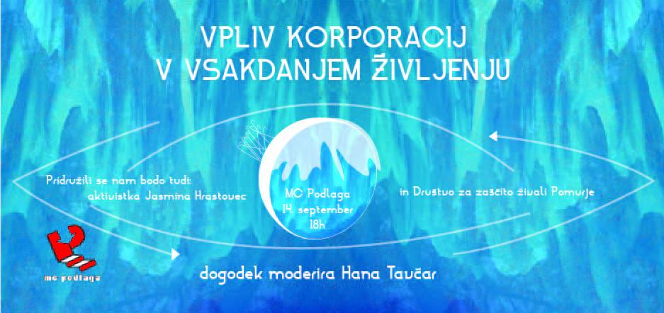 V četrtek, 14. 9. 2017, vabljeni v MC Podlago na družbeno-kritičen dogodek “Vplivi korporacij v vsakdanjem življenju”, ki ga bo moderirala dijakinja 2. b gimnazije Hana Tavčar. S Hano se bosta pogovarjali Mirjam Mulec in Jasmina Hrastovec, aktivistki Društva za zaščito živali Pomurje.
