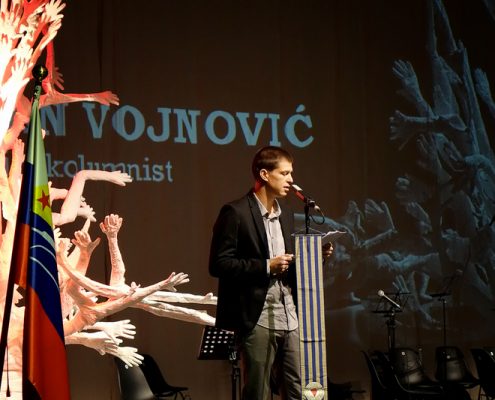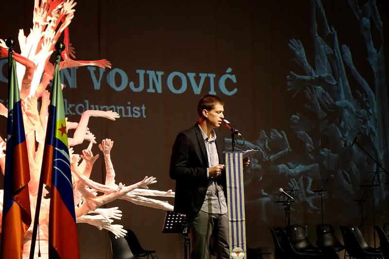 Pisatelj in kolumnist Goran Vojnović, ki je bil slavnostni govornik, je v čustvenem nagovoru poudaril, da se leta 2018 holokavsta ne bi smeli samo spominjati, temveč predvsem zavedati. Zavedati se dejstva, da je človeška zgodovina tudi zgodovina nečloveškega, zverinskega v človeku in da »holokavst ni le kratko, temno obdobje, v katerem je človek prenehal biti človek, temveč je ta tema v človeku, odkar človek je«.