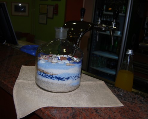 Ana in Anjel sta oblikovali še dekoracijo za pult v baru tako, da sta v večjo stekleno posodo izmenično vsipali mivko, sol in dekorativni granulat.