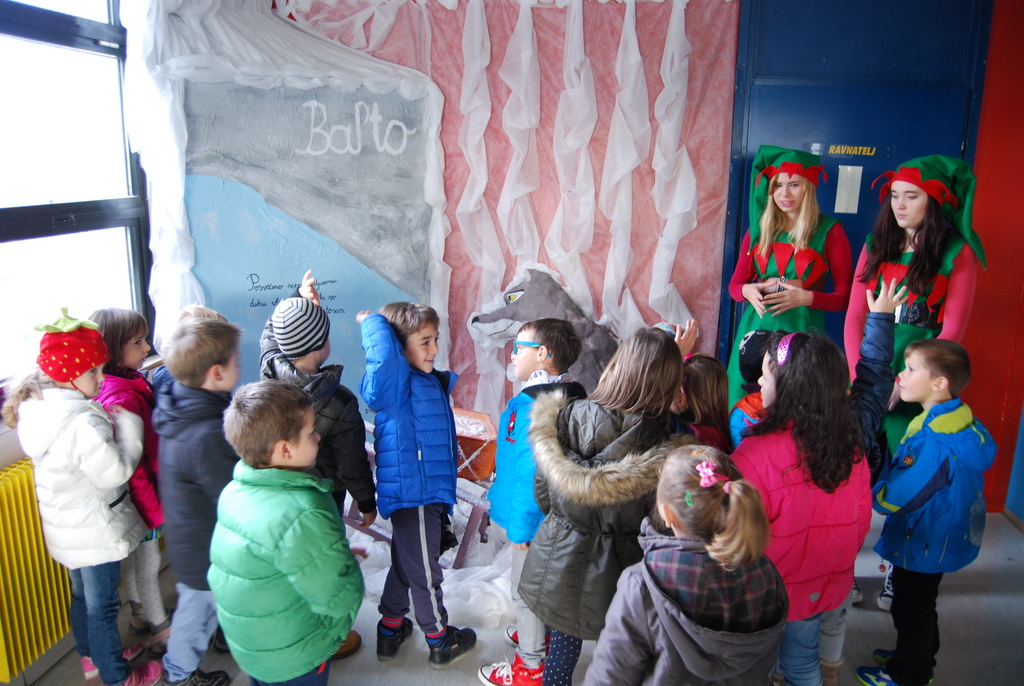 »V četrtek, 17. 12. 2015, so našo šolo skupaj z vzgojiteljicami obiskali otroci iz sežanskega vrtca. Malčke smo pričakale in sprejele škratolinke. Najprej smo jim pokazale Božičkove sani s skrbno pripravljenimi darili za otroke. Otroci so bili nad sanmi navdušeni, saj se je vsak lahko usedel nanje in poziral za spomin. Nato so si v 2. nadstropju ogledali stroj za izdelovanje sadnih bonbonov in drugih sladkarij. Zapeli so nam nekaj božičnih pesmic. Zatem so si ogledali še poročni kotiček. Najbolj jih je navdušila nevesta. Največja senzacija pa je bil seveda Božiček, ki so ga otroci nestrpno pričakovali. Vsak izmed njih mu je prišepnil svojo željo (kopač , barbike, ninja go, lego kocke, vrtalke (bejblejd), dojenčki, avtomobilčki, igrače iz risanke “Frozen”, batman, superman, plišaste igračke, pomaranče, bomboni, grad, ogrlice, uhani, prstani, lizike, sanke, roboti, dinozavri). Nato je vsak dobil bonbonček. Za konec smo otroke peljali še na ogled k sceni “Balto”. Bili so navdušeni, ker so risanko že večkrat gledali.