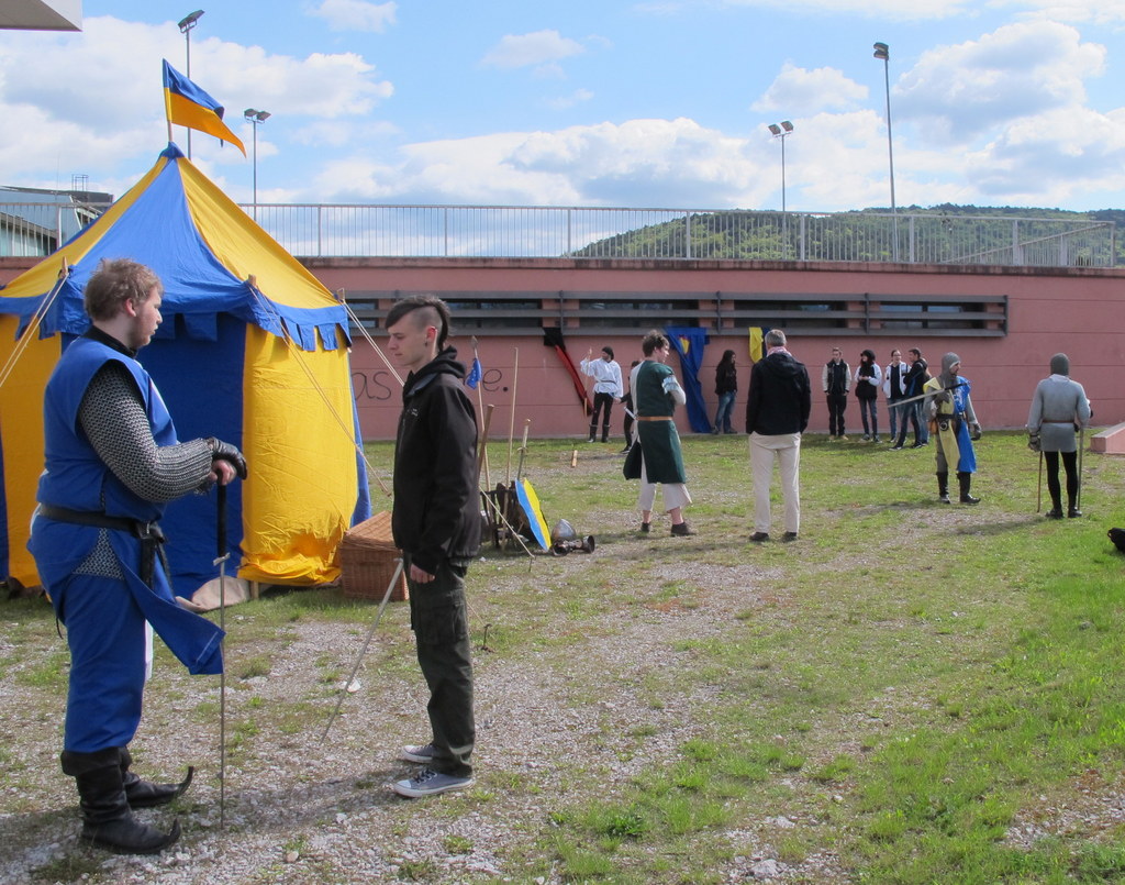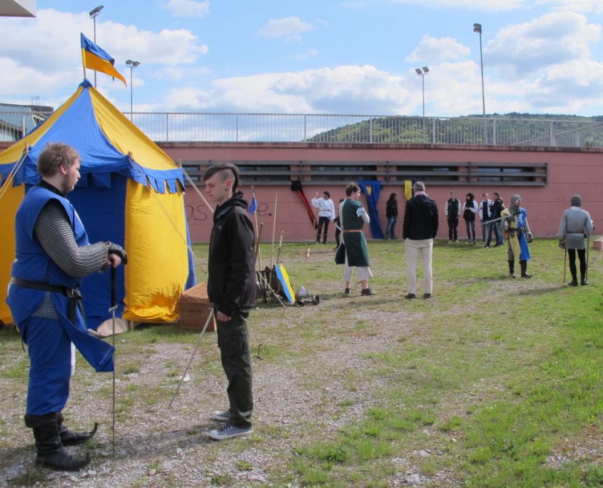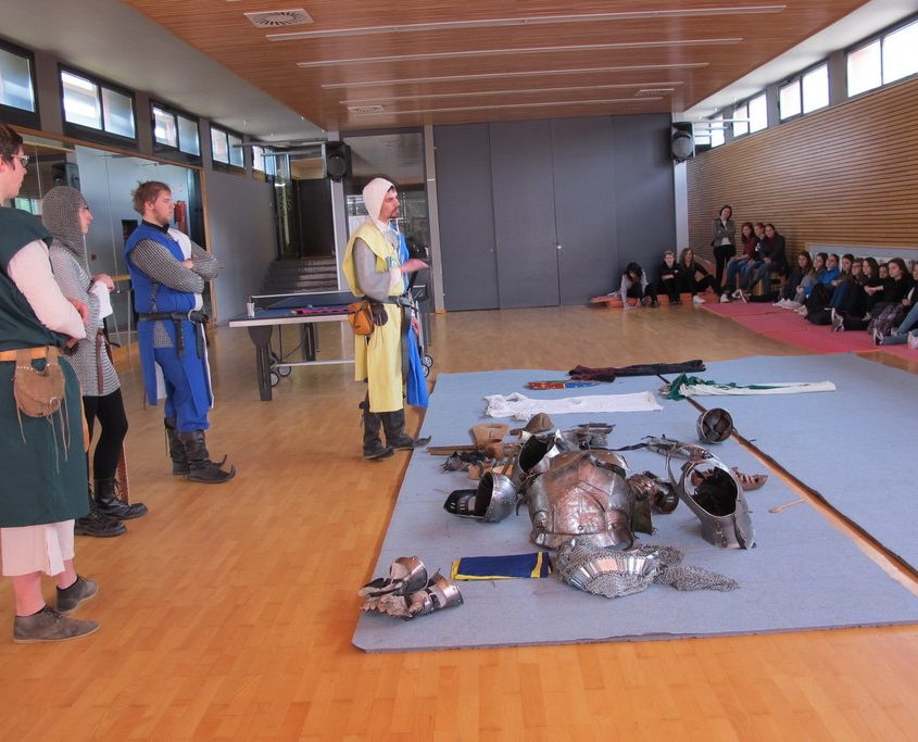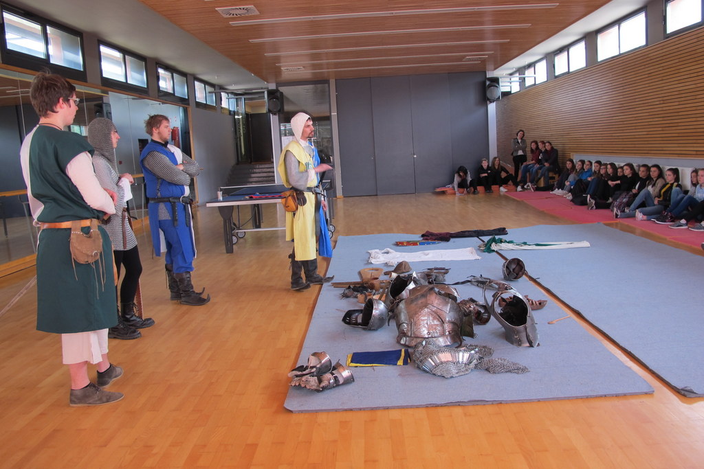 Po zelo zanimivi predstavitvi so si dijaki lahko ogledali zunaj postavljen šotor in se preiskusili v viteških veščinah – mečevanju in lokostrelstvu. Lahko pa so si nadeli tudi verižne srajce, oklepe in čelade in se prepričali, da biti vitez ni ravno lahko.