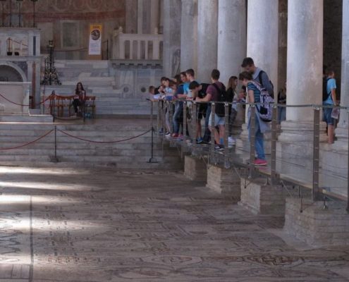 V Ogleju, ki je bil v rimskih časih z 200.000 prebivalci eno od največjih in najbogatejših mest, smo se sprehodili mimo rimskega foruma in si predstavljali vrvež nekdanjega veličastnega rečnega pristanišča. Večine tega antičnega mesta pa si nismo mogli ogledati, saj je še vedno pod zemljo. Potem smo vstopili še v baziliko Marijinega vnebovzetja in sv. Mohorja in Fortunata, srednjeveško središče krščanstva za naše kraje. Cerkev slovi po 760 m2 izjemnega talnega mozaika iz 4. stol. z bogato krščansko simboliko.