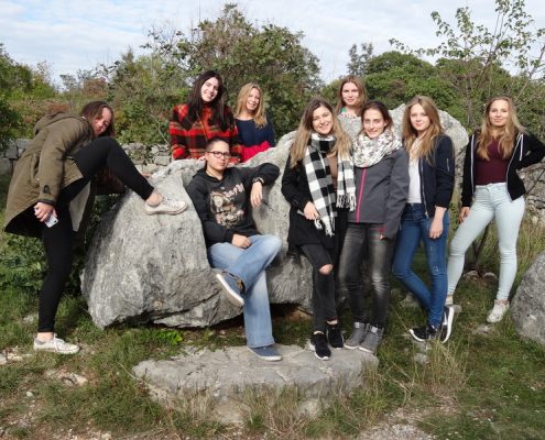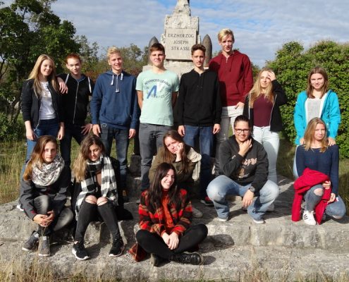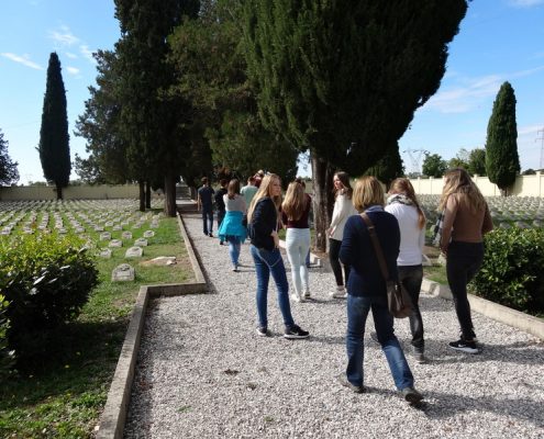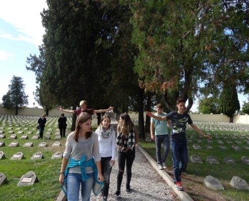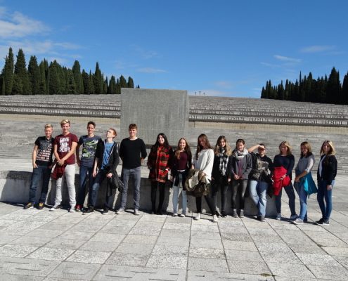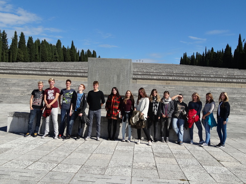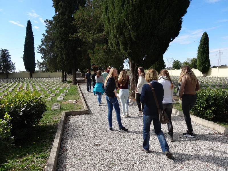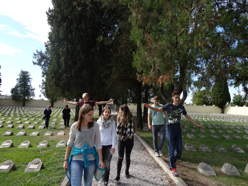 V petek 7. oktobra, so si dijaki 2. letnikov gimnazije, ki so vključeni v družboslovni sklop, ogledali južni del soške fronte. Najprej smo se povzpeli na vrh italijanske kostnice v Sredipolju (Redipuglii), ki je največji in najveličastnejši spomenik padlim v prvi svetovni vojni v Italiji. Zgradili so ga na pobočju griča Monte Sei Busi. Kostnica, imenovana tudi “spomenik stotisočerim”, hrani posmrtne ostanke 100.187 vojakov, ki so padli v okolici. Ustavili smo se še na pokopališču avstro-ogrskih vojakov v Foljanu, kjer je pokopanih največ Madžarov in Slovakov.